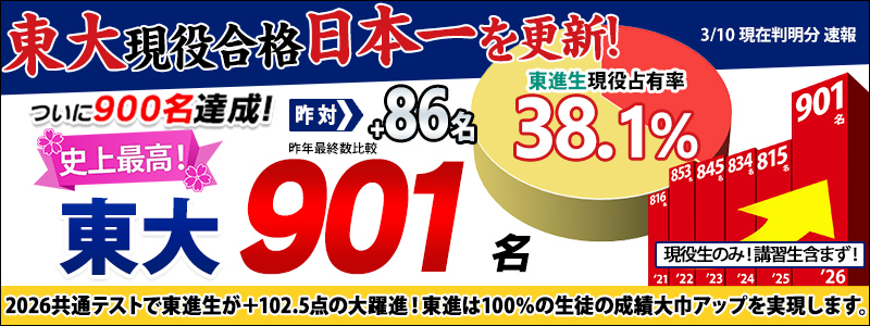 東進ハイスクール・東進衛星予備校などを運営する株式会社ナガセ(本社:東京都武蔵野市 代表取締役社長 永瀬昭幸)は、2026年の東京大学 入学者選抜において東進生901名が現役合格し、東進史上最高を更新したことをお知らせいたします。