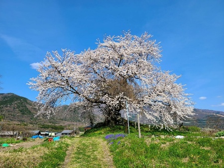古墳の上に立つ一本の桜。里山と田畑が広がる、気づかなければ通り過ぎてしまいそうな場所にありながら、思わず見上げてしまうほど、一本とは思えない迫力があります。周囲を遮るものがなく、大きく枝を広げたその向こうには広い空と伊吹山を望めます。民家や畑も近く、人の暮らしと自然がほどよい距離間で共存する、米原市らしい風景が見られます。