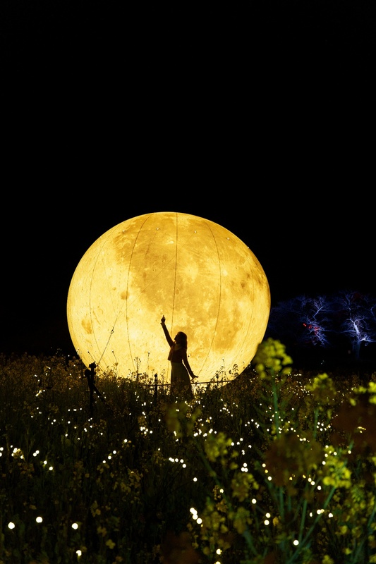 会場となる長崎鼻は、 周防灘を望む絶景スポットとして知られ、春には約2,700万本の菜の花が一面に広がる九州有数の花の名所です。本イベントでは、菜の花畑の中央に巨大な“月”のオブジェを設置し、LED照明で菜の花をやわらかく照らすことで、昼とは異なる幻想的な夜の景色を演出します。