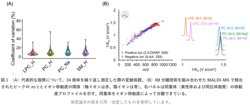 開発した測定系を使うと、1サンプルの分析時間はわずか1秒以下となり、一度の測定でヒトの血漿から約1,000種類もの代謝物由来のシグナルを安定して検出できました。測定の再現性も高く、サンプル内の複数箇所から得られるシグナルを平均化することでばらつき(CV)は20 %未満に抑えられています(図1A)。また、クロマトグラフィー分離を行わないMALDIでは個別に検出することが難しいとされる「同重体(質量は同じだが形の違う分子)」も、イオンモビリティにより明確に区別できるようになりました(図1B)。