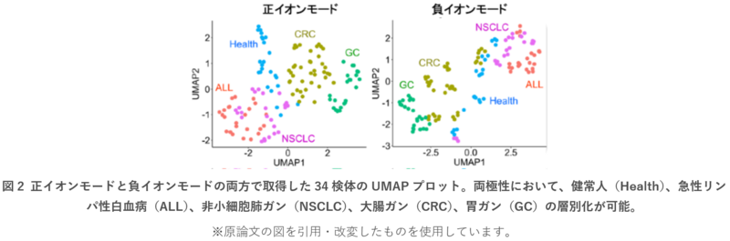 さらに本研究では、この超高速測定が実際の疾患の違いを捉えられるかを確かめるため、健常人と4種類のガン患者の血漿を解析しました。その結果、34検体という小規模ながら、データを圧縮表示するUMAPと呼ばれる手法で、ガン種ごとの代謝物パターンの違いが明確に表れました(図2)。UMAPは高次元データを2次元に圧縮して表示する手法であるため、一部の検体では異なる群が近接して表示される場合もありますが、各患者由来のデータは全体として疾患ごとに異なる分布傾向を示していました。特に、ガン患者血漿で濃度が低下することが知られる「リゾホスファチジルコリン(LPC)」が、本研究のデータでも同様に低下しており、実臨床で見られる変化を正しく捉えられることが確認できました。