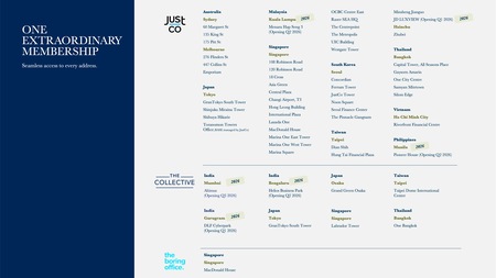 JustCo(ジャストコ) は、2011 年にシンガポールで創業し、現在はアジア太平洋地域 の主要10都市でシェアオフィス&コワーキングスペースを運営しています。インテリジェントな空間設計と革新的なソリューションを通じて、企業、人、そしてアイデアをつなぐアジア太平洋地域を代表するフレキシブルワークスペースパートナーです。ラグジュアリーブランド THE COLLECTIVE(ザ・コレクティブ)、プレミアムブランド JustCo(ジャストコ)、そしてエッセンシャルブランド the boring office (ザ・ボーリングオフィス)の 3 つのコワーキングブランドを展開し、多様化する働き方に対応しています。