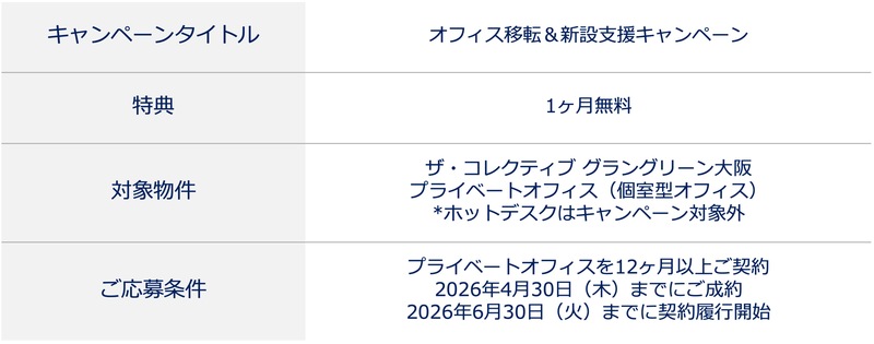 シンガポール発のプレミアムコワーキングブランド JustCo(ジャストコ) が運営する、エグゼクティブ向けシェアオフィス 「ザ・コレクティブ グラングリーン大阪」 は、1ヶ月無料の「オフィス移転&新設支援キャンペーン」を、ご好評につき4月30日(木) まで延長します。