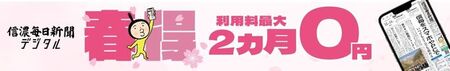 人事異動検索サービスは、信毎デジタルの有料会員が利用できます。5月11日まで実施中の「春得」キャンペーンに申し込むと、新規登録のデジタル利用料が最大2カ月無料になり、お得に検索サービスが利用できます。無料期間中に解約しても違約金などはなく、料金は発生しません。この機会に信毎デジタルをお試しください。