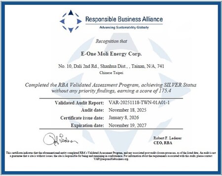 Molicelの社長であるCasey Shiue氏は次のように述べました。「RBAシルバーステータスの取得は、『責任あるパワー(Power with Responsibility)』への当社のコミットメントを示すものです。」「ヒューマノイドロボティクスから高性能エネルギー貯蔵まで、世界最先端の技術分野の需要に応えるために生産を拡大する中で、当社は製造するすべてのセルが倫理的な慣行と社会的誠実性に基づいていることを確実にしています。」