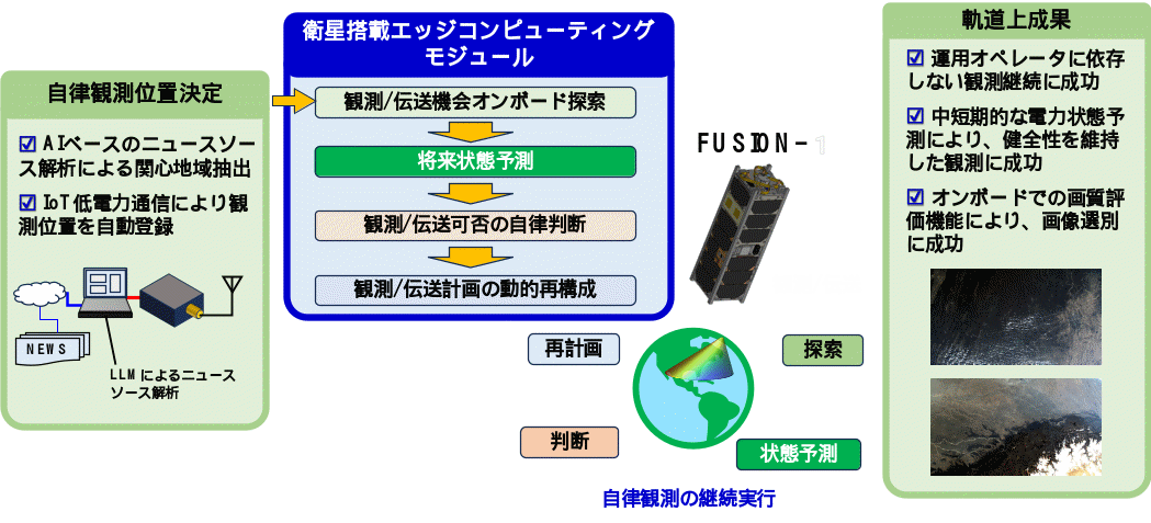 これらの技術により、「ニュース解析による観測地点選定」「低電力通信による情報伝達」「衛星上での将来状態予測」「自律判断およびオンボード処理」を一体化した自律観測システムを構築し、軌道上でその動作を確認しました。