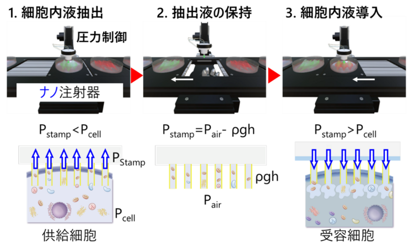 図:圧力制御可能なナノ注射器による細胞内液・ミトコンドリア移送技術