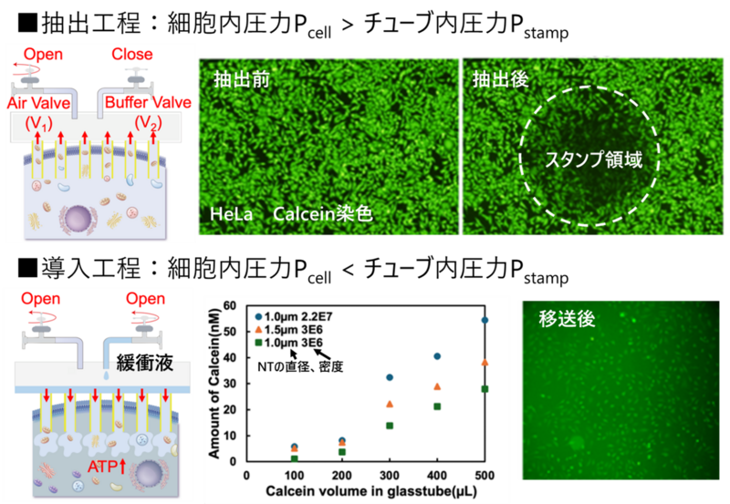 早稲田大学大学院情報生産システム研究科の三宅 丈雄(みやけ たけお)教授らの研究グループは、ナノチューブ膜を用いたナノ注射器(ナノチューブ膜スタンプ)に圧力制御機構を搭載させることで、細胞内液やミトコンドリアなどの細胞内成分を別の細胞へ高効率かつ高生存率を保ったまま直接移送することに成功しました。