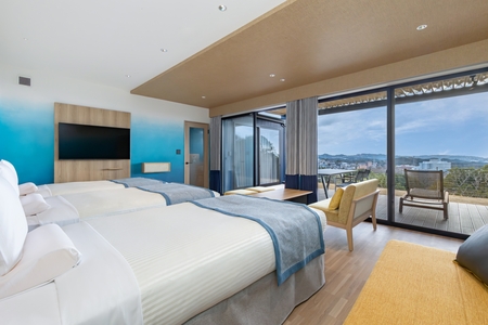 海への眺望を生かしたブルーを基調としたデザインのヴィラ客室。プライベートドッグランやBBQグリルや本格サウナを備え、愛犬とともに気兼ねなく過ごせる贅沢なプライベート空間です。ヴィラご宿泊者様限定の「テラスBBQ」では、機材や食材をご用意しているため準備の手間なく、本格的なBBQをお楽しみいただけます。愛犬とともに南紀白浜の自然を感じながら、特別なひとときをお過ごしください。