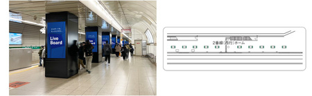 神戸市営地下鉄三宮駅2番線ホームに設置された75インチ、計20面のデジタルサイネージです。1番線ホームに設置された「三宮ホームDS-1」は2025年1月に接続を開始しており、東行き、西行きのどちらの利用者にも訴求が可能になりました。