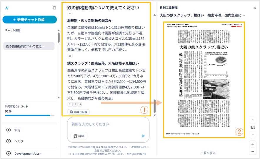 回答画面(①生成データ ②記事原文※) ※日刊工業新聞 2025年12月16日付 掲載許諾済