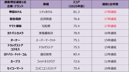 当該企業・ブランドが、顧客満足において、長期(10年以上)にわたり連続1位となっている企業・ブランドは以下の通りです。