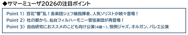 このほか、恒例のパイプオルガン公演、ジャズ公演、こども向け公演(2公演)、市内音楽大学公演(2公演)など多彩なラインアップでお届けします。また毎年ご好評いただいている公演前の「プレトーク」や「プレコンサート」、音楽祭の期間中に近隣提携店舗で割引やドリンクサービスなどが受けられる「パートナーショップ」、名物新聞「ほぼ日刊サマーミューザ」など“音楽祭をもっと楽しむ”ための企画も満載。浮世絵風キービジュアルにちなんで、期間中に浴衣でご来場の方には特製ステッカーを進呈します。チケットは4月27日(月)より一般発売、この夏もぜひサマーミューザをお楽しみください。