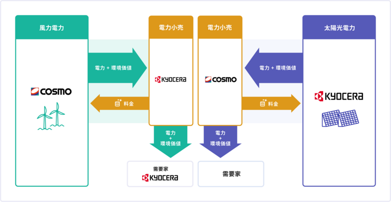 京セラとコスモエネルギーグループ、 風力発電・太陽光発電による再エネの相互調達を4月より開始