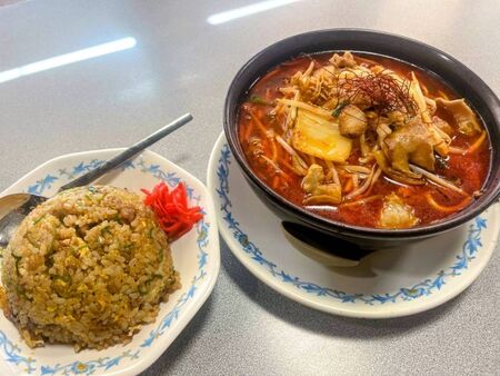 名物メニュー「ドラゴンラーメン」は、豆板醤の効いた赤いスープに野菜、粒ニンニク、ホルモンがたっぷり入ったインパクト抜群の一杯。辛味と旨味が絡み合う魅惑の味わいです。そんなパンチのあるラーメンと合わせたいのが、香ばしくパラっと仕上がったチャーハン。シンプルな味わいのチャーハンがラーメンの辛味を引き立て、交互に食べる手が止まらない組み合わせです。