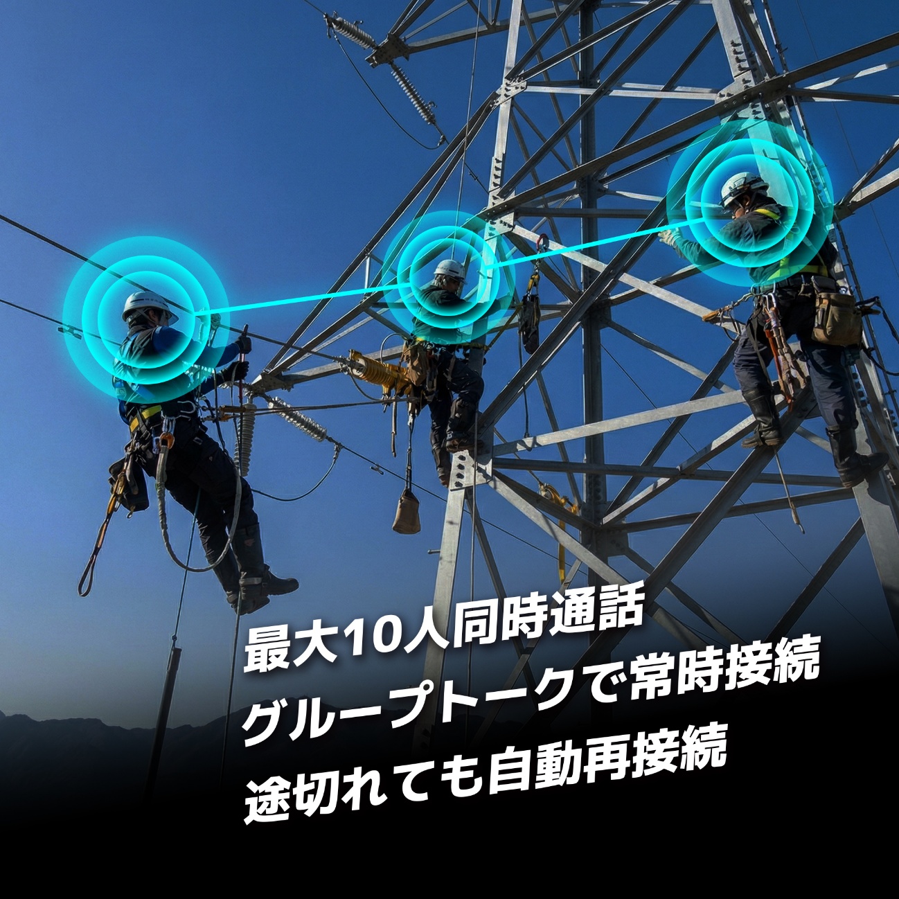 スマホを介さずデバイス同士最大10台同時に繋がるため、常にハンズフリーで作業者間でコミュニケーションが取れ、両手が塞がる作業の合間でも会話を行うことができます。