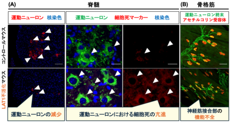 本研究では,神経細胞のアミノ酸トランスポーターL-type amino acid transporter 1(LAT1)(遺伝子名:Slc7a5)(※2)の不活化が,新生児期の脊髄運動ニューロン(※3)の変性と神経筋接合部(※4)の機能不全,およびそれらに伴う協調運動(※5)障害を引き起こすことを発見し,LAT1が運動ニューロンへのアミノ酸供給と協調運動能の形成に重要な役割を担っていることを明らかにしました。本研究成果は,神経細胞のアミノ酸トランスポーターを標的とした運動ニューロン疾患に対する新規治療・診断法の開発に貢献することが期待されます。