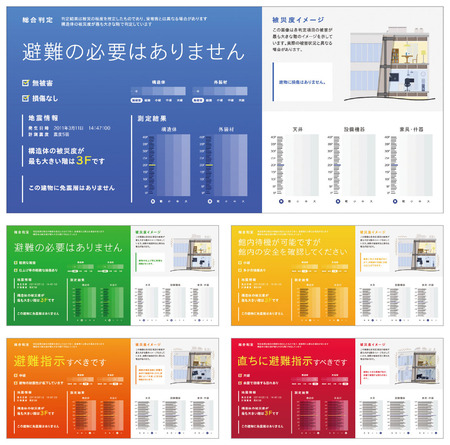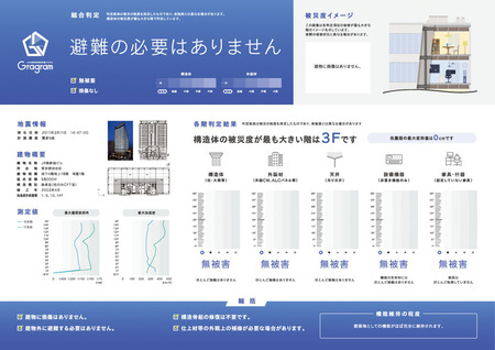 地震発生後に自動的に詳細なコメント付きの「診断レポート」を作成します。建物のBCP計画に合わせて、防災拠点としての利用可否、建物の継続使用の可否についての情報を適切に提供します。