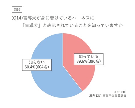 盲導犬は必ずハーネスという道具を身に着けており、周囲の方々に盲導犬であることが分かるように表示がされています。また、盲導犬使用者証という法律に基づいた書類を携帯しており、盲導犬かどうかを確認するために、こうした表示や書類を確認することは失礼なことではありません。しかし、事業所で働く従業員の60.4%が、『盲導犬が身に着けているハーネスに「盲導犬」と表示されていること(Q14)』を「知らない」と回答しました(図10)。