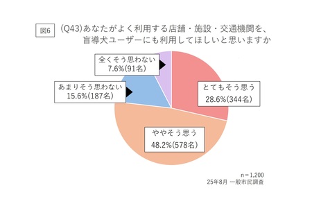 『あなたがよく利用する店舗・施設・交通機関を、盲導犬ユーザーにも利用してほしいと思いますか(Q43)』という問いに対し、「とてもそう思う」「ややそう思う」と回答した人は全体の76.9%にのぼりました(図6)。