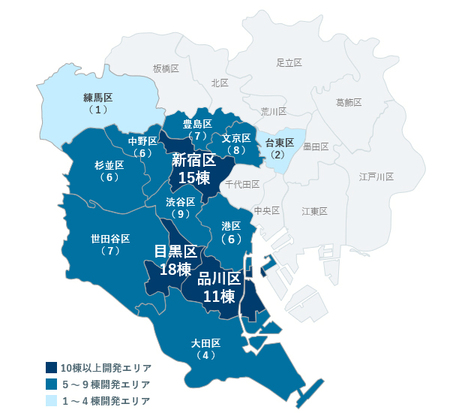 当社が開発するデザイナーズ賃貸マンションシリーズ「LEGALAND」は、これまで東京都内を中心に国内100棟を超える開発実績(LEGALAND+含む)を誇っています。当社がこれまで培ってきた不動産開発のノウハウやこだわりによって生み出される「LEGALAND」は、快適な居住空間をご提供するとともに、優れた投資資産として国内外の事業会社及び個人投資家様からも高い評価をいただいています。