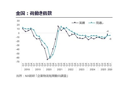 2025年12月時点での貨物輸送量の速報値は、輸送トン数ベースで、前年同月比4.1%増を記録した。一方で輸送トンキロは9.2%減少しており、1運航当たりの平均輸送距離の短縮が示唆される。NX総研の荷動き指数は、同年第4四半期は、前期から10ポイント改善させ「マイナス4ポイント」を記録した。2026年第1四半期の見通しは「マイナス6」となり前期より2ポイント低下する予想。しかし、調査時点で織り込まれていなかったホルムズ海峡の緊迫化が、今後の指数をさらに押し下げるリスクを孕んでいる。