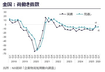 2025年12月時点での貨物輸送量の速報値は、輸送トン数ベースで、前年同月比4.1%増を記録した。一方で輸送トンキロは9.2%減少しており、1運航当たりの平均輸送距離の短縮が示唆される。NX総研の荷動き指数は、同年第4四半期は、前期から10ポイント改善させ「マイナス4ポイント」を記録した。2026年第1四半期の見通しは「マイナス6」となり前期より2ポイント低下する予想。しかし、調査時点で織り込まれていなかったホルムズ海峡の緊迫化が、今後の指数をさらに押し下げるリスクを孕んでいる。