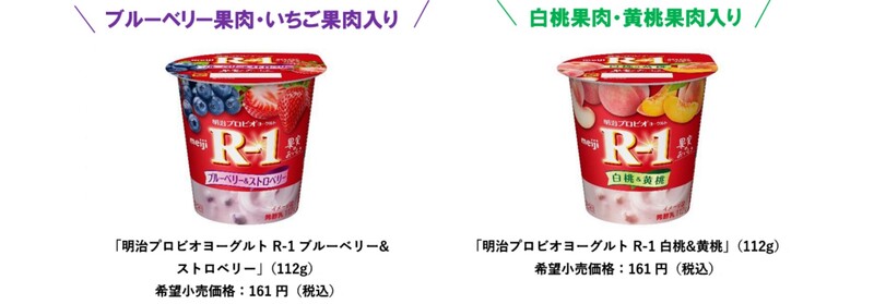 「明治プロビオヨーグルトR-1ブルーベリー&ストロベリー」 「明治プロビオヨーグルトR-1 白桃&黄桃」