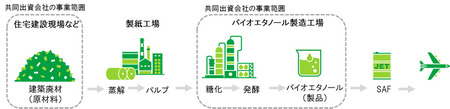 原材料には住友林業グループの住宅の建設・リフォーム・解体現場で発生する建築廃材などを活用します。住友林業は原材料の安定調達とバイオリファイナリー製品の共同開発・販売を担います。バイオエタノールはレンゴーグループがバイオマス化学品分野で培ってきた技術を活用し、同グループの製紙工場敷地内に新設するプラントで製造します。製造したバイオエタノールは石油元売事業者に販売し、SAFに転換後、航空燃料として使用する計画です。