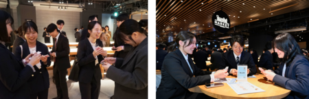また第2部では、歓迎会に参加しているグループ会社の全新入社員784名が、アジア初上陸の大規模フードマーケット「タイムアウトマーケット大阪」に集結し、交流会を実施。ランチ会や自身の「幸せを感じる瞬間」を記載したこの日限りのオリジナル名刺の交換会を通じて、部署や地域を越えたつながりが生まれ、新入社員同士の一体感を育むカジュアルな交流の場となりました。