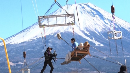 草原を飛んでいるシーンは高原に移動して、クレーン車2台で作ったワイヤー動線に4点で固定したソファーをつり上げ、同じ動線上に松山さんをつるす仕掛けを使って収録しました。ここでは、カメラマンも同様の仕掛けでつるされたまま撮影をし、より臨場感のある映像を追求することに。本番直前、ハーネスを装着してカメラを持っているカメラマンを見た瞬間、松山さんは思わず「え、浮くんですか?」「マジっすか!?」と目を丸くしていました。