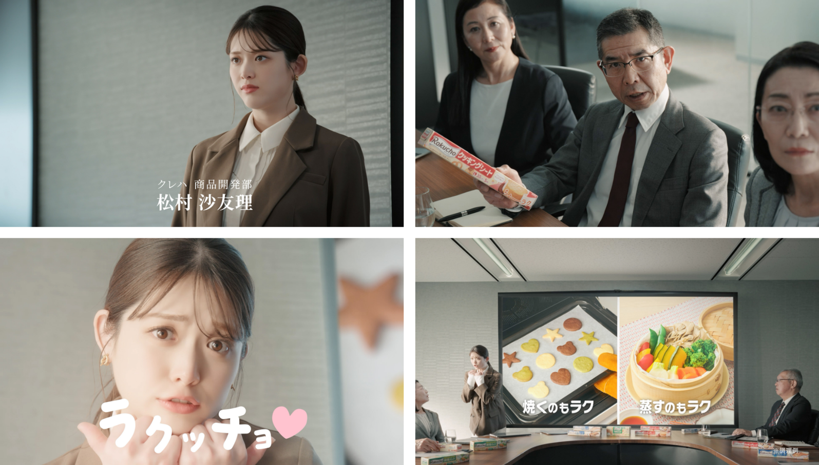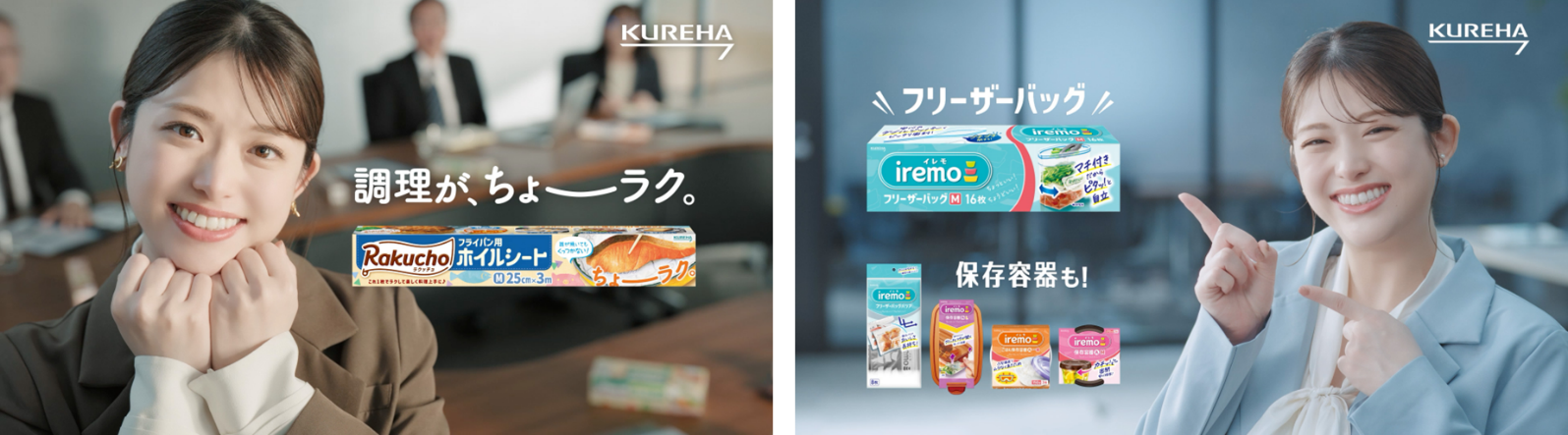 今回のCMでは、新ブランドの商品開発に情熱を注ぐ「クレハ社員」を、私⾃⾝楽しみながら演じさせていただきました。調理が“ちょーラク”になる「Rakucho(ラクッチョ)」と、⾷材から⽇⽤品まであれもこれも⼊れられる 「iremo(イレモ)」 。私自身、毎日バタバタと過ごしているので調理や日常の色々な場面で使える便利なアイテムに助けてもらいながら料理やお片付けを超可愛く楽しくやっていきたいです♡