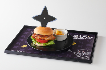 鼠小僧のミニキャラクターをあしらい、見た目にも楽しいメニューとして展開します。バーガーの真ん中に命中した手裏剣は、ランチョンマットに描かれた鼠小僧がこっそり仕掛けたサプライズです。ドリンクをデコレーションするラベルやストロータグまでキャラクター尽くしで、手にした瞬間からワクワク感が広がります。