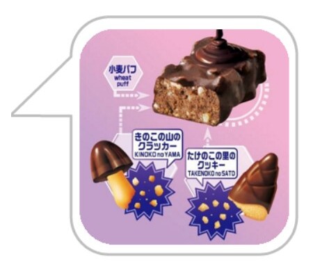 本商品は、ひとくちサイズのチョコスナックです。「きのこの山」の“カリッ”としたクラッカーと「たけのこの里」の“サクッ”としたクッキーを砕き、これにミルク風味のチョコレートと小麦パフを加えてバー状に成型し、最後にビターチョコレートでコーティングしています。ザクザクとした食感と、ミルク風味とビター2種類のチョコレートの味わいをお楽しみいただけます。