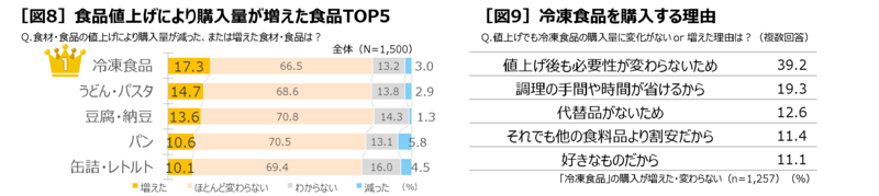 値上げの影響で購入量が減ったか増えたか、食品別(14品目)※1に答えてもらいました。すると、全ての食品で購入量は「変わらない」が多くなっていますが、購入量が増えた食品は、「冷凍食品」(17.3%)、「うどん・パスタ」(14.7%)、「豆腐・納豆」(13.6%)の順となり、冷凍食品は購入量が増えた食品第1位です[図8]。