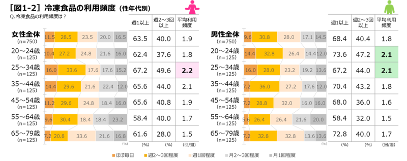 普段から冷凍食品を「月1回以上」利用している20歳以上の男女1,500人(各750人ずつ)に聞きました。冷凍食品の利用頻度は全体で「週2~3回程度」が29.7%、「週1回程度」が25.7%となり、平均回数は1.8回/週となりました[図1-1]。属性別に見ると、女性の63.5%、男性の68.4%が「週1回以上」利用し、平均回数は女性が1.9回/週、男性が1.8回/週でした。また、女性の25〜34歳が平均2.2回/週、男性20〜24歳と男性25〜34歳が平均2.1回/週など、若い世代において冷凍食品の利用頻度が高い傾向がうかがえます[図1-2]。