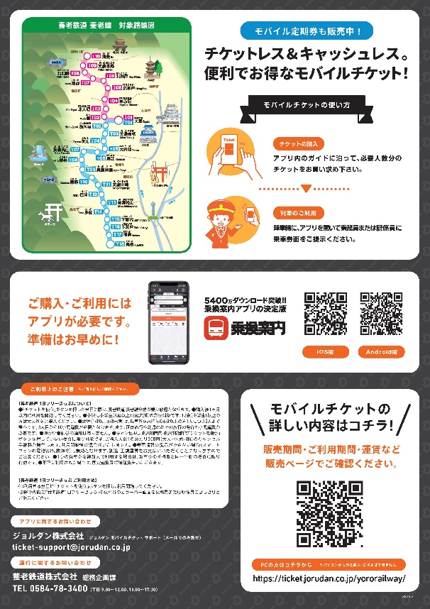 ジョルダン株式会社(本社:東京都新宿区、代表取締役社長:佐藤俊和、以下「ジョルダン」)と、養老鉄道株式会社(本社:岐阜県大垣市、代表取締役社長:宗藤洋、以下「養老鉄道」)は、4月9日(木)より、「養老鉄道1日フリーきっぷ」、「養老鉄道 通勤定期券」を、モバイルチケット(※)で販売します。