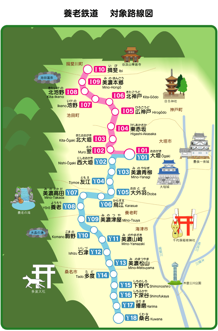 養老鉄道は、三重県桑名市と岐阜県揖斐川町を結んでおり、沿線には歴史・自然・温泉など多彩な観光スポットが点在しています。岐阜県側には、県を代表する名瀑・養老の滝や、広大な敷地に四季折々の自然が広がる養老公園があり、散策や自然観光を楽しむことができます。また、三重県側には、上げ馬神事で知られる多度神社や歴史情緒あふれる街並みが残るエリアもあり、ゆったりとした時間を過ごすことができます。