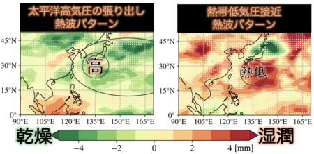 一般的にもよく知られているように、日本の熱波は、夏季の太平洋高気圧の西への張り出しにより発生する傾向があります。高温−乾燥フィードバック効果が弱いため、熱波は長続きしせず、太平洋高気圧による熱波が、日本の熱波の大部分であると考えられてきました。