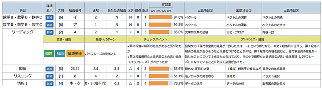 成績表は試験実施後、中5日で返却されるため、受験時の記憶が新しいうちに復習が可能です。個人成績表では、志望校の合格可能性や偏差値の表示はもちろん、志望校合格まであと何点必要かを示します。個人成績表からアクセスできるWEB成績表では、優先的に対策をすることで大きく得点を伸ばせる「正解必須問題」がわかります。さらに、「正解必須問題」をなぜ間違えたのか、チェックすべきポイント、具体的なアドバイスまで提示。実力講師陣によるわかりやすい合格指導解説授業も活用すれば、スピーディーに弱点克服が可能です。