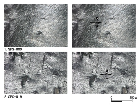 また、実験試料との対比から、押圧剥離法によって小形石刃が剥離される途上で、平滑な面を作り出すために、硬い石を利用した砥石によって石核の複数の面が磨かれていたことが推定できました。このような行為の痕跡が把握されることは大変珍しく、黒曜石を利用した石器作りの比較研究を進めていくうえで、類例の確認が期待されます。