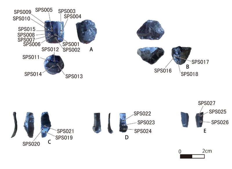 遺跡から発見された黒曜石の産地を推定するために、エネルギー分散型蛍光X線分析による化学組成の分析が実施されました。また、石器の製作・使用過程を明らかにするために、剥離面の前後関係の識別にもとづいた剥離工程解析や低倍率・高倍率の顕微鏡を用いた痕跡分析が行われました。黒曜石が磨かれた際の道具や動作を同定しようとする際には、その同定基準を把握するために、同じような痕跡を復元的に作り出す実験も遂行されました。