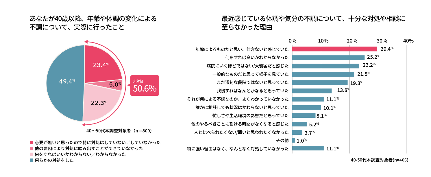 40~50代の女性において、自身の不調に気づいていても、そのうち約半数(50.6%)が「特に対処していない」または「何をすればいいかわからない」と行動を起こせていない実態が判明しました。