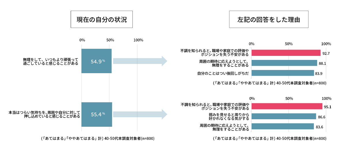 現在の自身の状況について、半数以上の女性は「無理をして、いつもより頑張って過ごしていると感じることがある」(54.9%)、「本当はつらい気持ちを、周囲や自分に対して押し込めてい ると感じることがある」(55.4%)、と回答しました。 その理由の第一位に共通して挙げられた回答は、「不調を知られると、仕事や家庭での評価やポジションを失う不安がある」(「無理をして、いつもより頑張って過ごしていると感じることがある」:92.7%、「本当はつらい気持ちを、周囲や自分に対して押し込めていると感じることがある」95.1%)となっており、90% 以上の女性が仕事や家庭に不調を知られることへの影響を不安視していることが明らかになりました。