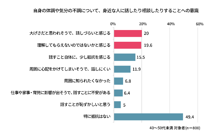 ● 不調を周囲に相談することに対し、大げさだと思われそうで話しづらい」(20.0%)や「理解してもらえないのではないか」(19.6%)という周囲の目を不安視