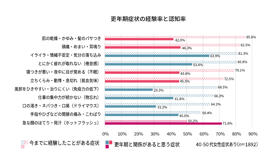 Ⅰ. 40〜50代女性の7割が経験する「肌の乾燥・頭痛・不眠」、半数以上が更年期関連不調と認知されず。更年期のサインは身近な不調ほど見逃される