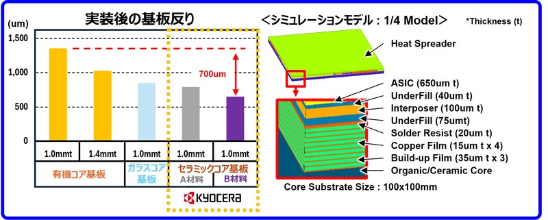 本基板は、高密度配線が可能で基板剛性に優れた独自のセラミック材料を活用することで、先端半導体パッケージ実装時の反りの低減を実現します。