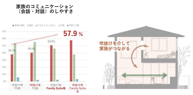 当社の研究機関である総合住宅研究所の調査によると、吹き抜けを備えた住まいでは、家全体で家族の気配を感じることができ、家族のコミュニケーションのしやすさが大きく向上することが確認されています。